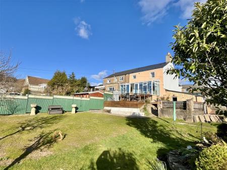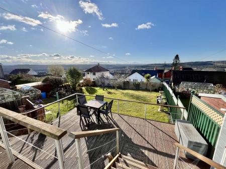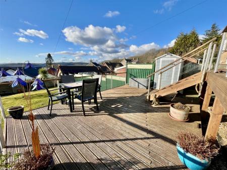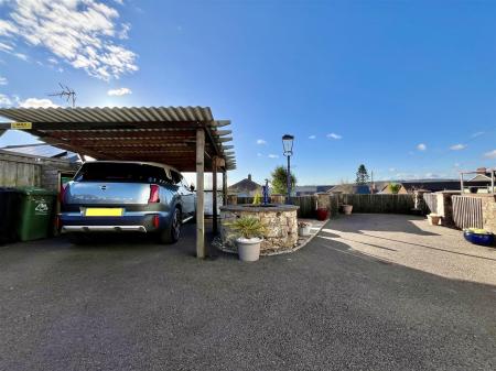 Outside - A pair of wooden gates open onto a spacious tarmac driveway with a single carport, providing ample parking for multiple vehicles. A charming feature well sits within the driveway, while access to the double garage is available alongside steps leading up to the front entrance. At the rear of the property, the decked veranda extends from the conservatory, offering the perfect spot to take in the breath-taking views. The garden is primarily laid to lawn, complemented by a rockery, scattered shrubs, and small trees. Additionally, there are two greenhouses, ideal for gardening enthusiasts.
