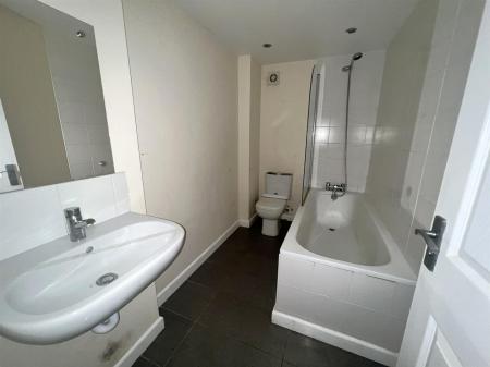 Bathroom - 2.74m x 1.52m (9'00 x 5'00) - White suite with modern side panel bath, mixer tap and shower attachment fitted over, close coupled w.c, wall mounted wash hand basin with tiled splashback, monobloc mixer tap, inset ceiling spots, extractor fan, wall mounted chrome towel radiator.