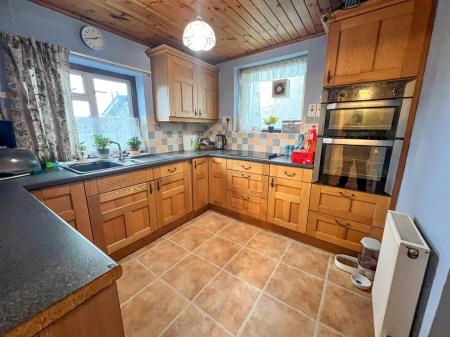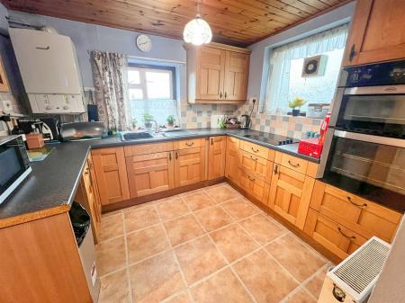 Kitchen - 2.95m x 2.57m (9'08 x 8'05) - One and a half bowl single drainer sink unit with mixer tap over, rolled edge worktops, range of base and wall mounted units, tiled surrounds with power points, built-in for ring electric hob, electric double oven and grill, gas fired central heating and domestic hot water boiler, boiler timer controls, timber clad ceiling, ceiling light, side aspect obscure double glazed window with extractor fan inset, rear aspect double glazed window with view over the garden and towards forest and woodland in the distance, opening into: