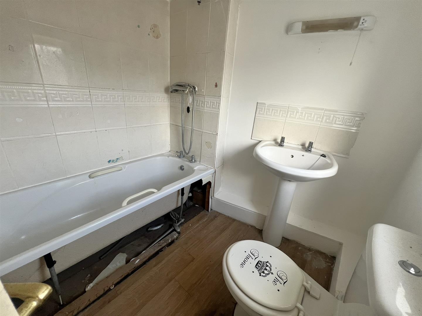 Bathroom - White suite with modern side panel bath, pedestal wash hand basin, close coupled w.c, mains fed shower, tiled splashback, inset ceiling spots, shaver light and point, single radiator, extractor fan, rear aspect upvc obscure double glazed window.
