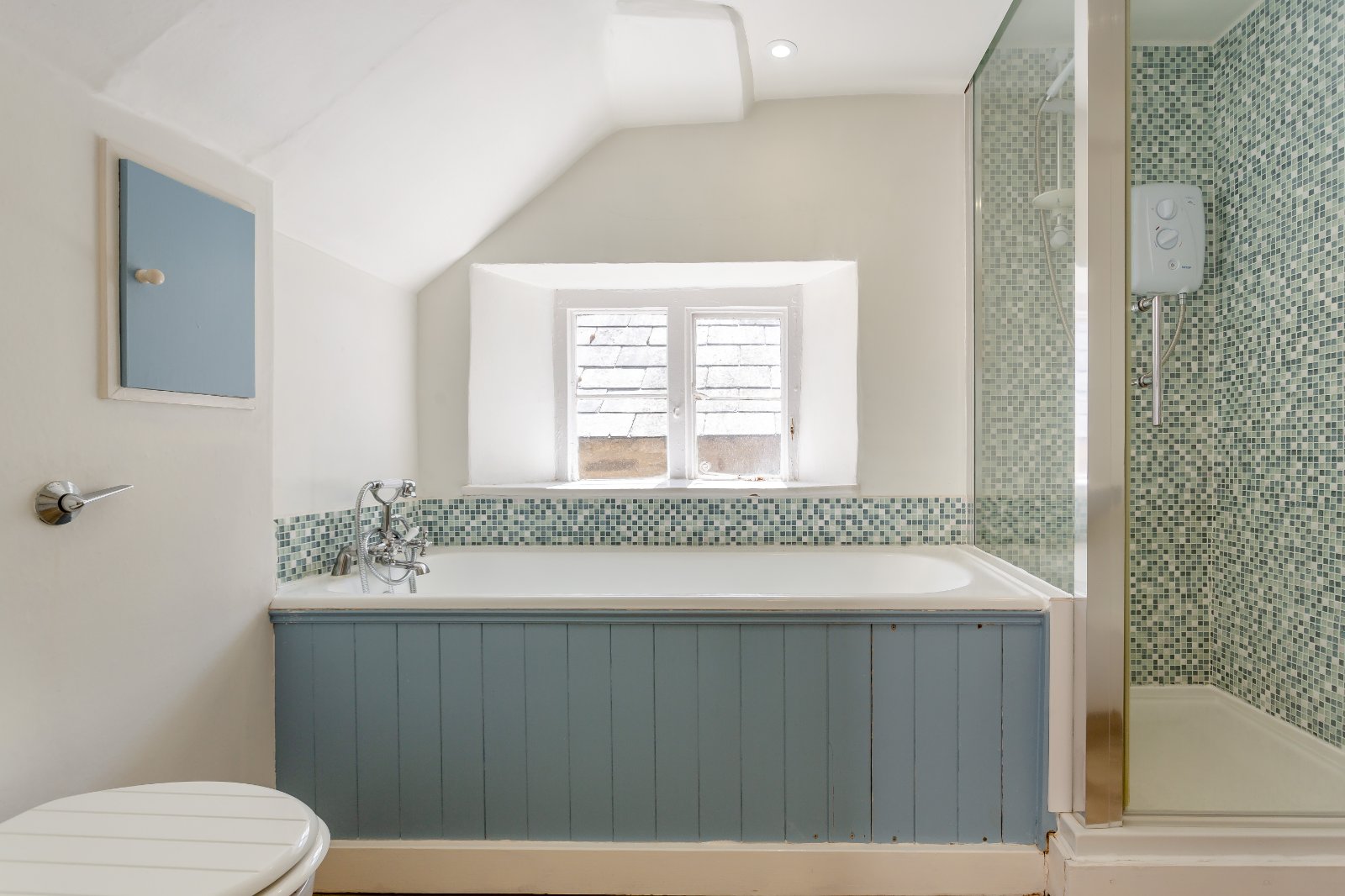 The front door opens into a light living room, with a wood burning stove for those cozy evenings, beyond lies the kitchen/breakfast room with a range of fitted units and a door opening to the rear courtyard and garden beyond. A first floor landing is bathed in light thanks to a sky light and provides space to accommodate a desk or soft seating. A well-proportioned double bedroom lies to the front and well appointed family bathroom benefits from a bath and shower.