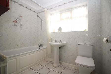 White suite comprising of panelled bath with mixer tap and shower attachment, pedestal wash basin, low level WC, tiled walls and floor, radiator, double glazed side window.