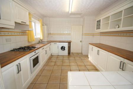 Fitted with a range of white laminated fronted units comprising wood block effect rolled edge work surfaces with cupboards and drawers below, inset single drainer sink unit with mixer tap, wall mounted gas fired boiler, matching eye level cupboards, loft access, fitted oven, gas hob and extractor hood over, tiled floor and walls, access to