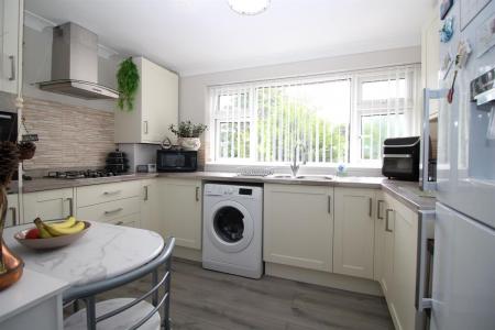 Re-fitted with a range cream coloured coloured panelled fronted units comprising of laminated rolled edge work tops over, cupboards and drawers below, matching eye level cupboards, inset single drainer sink unit with mixer taps, cupboard housing wall mounted 'Worcester' gas combi boiler, fitted 4 ring gas hob with extractor hood over plus fitted oven, radiator, wood effect flooring, double glazed rear window.