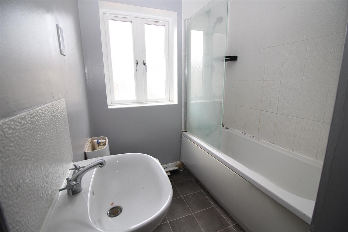 White suite comprising of panelled bath with mixer tap and shower attachment, pedestal wash hand basin, low level WC, radiator, double glazed front window.