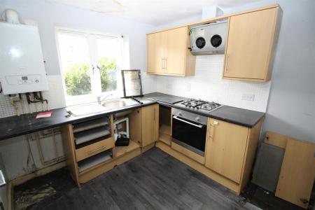 Fitted base and eye level units with fitted work tops, inset single drainer sink unit, fitted oven and hob, wall mounted gas boiler, radiator, tiled splash backs, double glazed front window