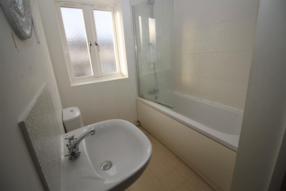 Three piece white suite comprising of panel enclosed bath, pedestal wash hand basin and low level W.C, tiled splashbacks, double glazed window to front, heated towel rail.