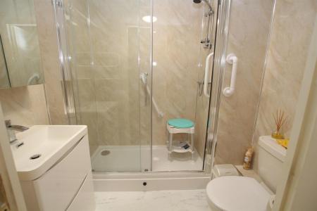 Recently fitted comprising of large shower cubicle, low level W.C and vanity wash hand basin, panelling to walls.