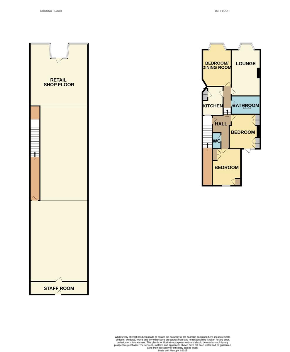 A 36' 4" middle section of the shop floor narrows to 18' 6" before opening back to the quoted width. Two large display windows to front, warm air heater that operates via the gas boiler located on the first floor. Door to external hall with stairs to first floor and door to