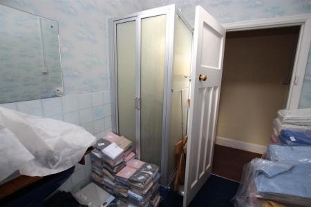 Skylight window, single radiator, coloured suite comprising of panel enclosed bath, pedestal wash hand basin, single shower cubicle, part tiling to walls.