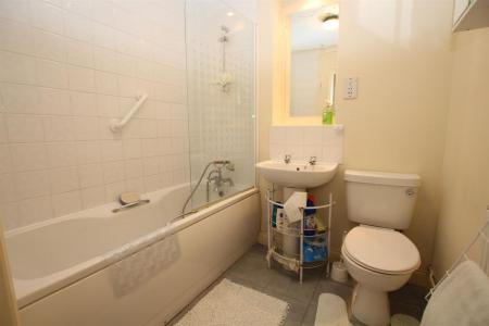 Three piece suite comprising of panel enclosed bath, pedestal wash hand basin and low level W.C, coved and skimmed ceiling, radiator, extractor fan.