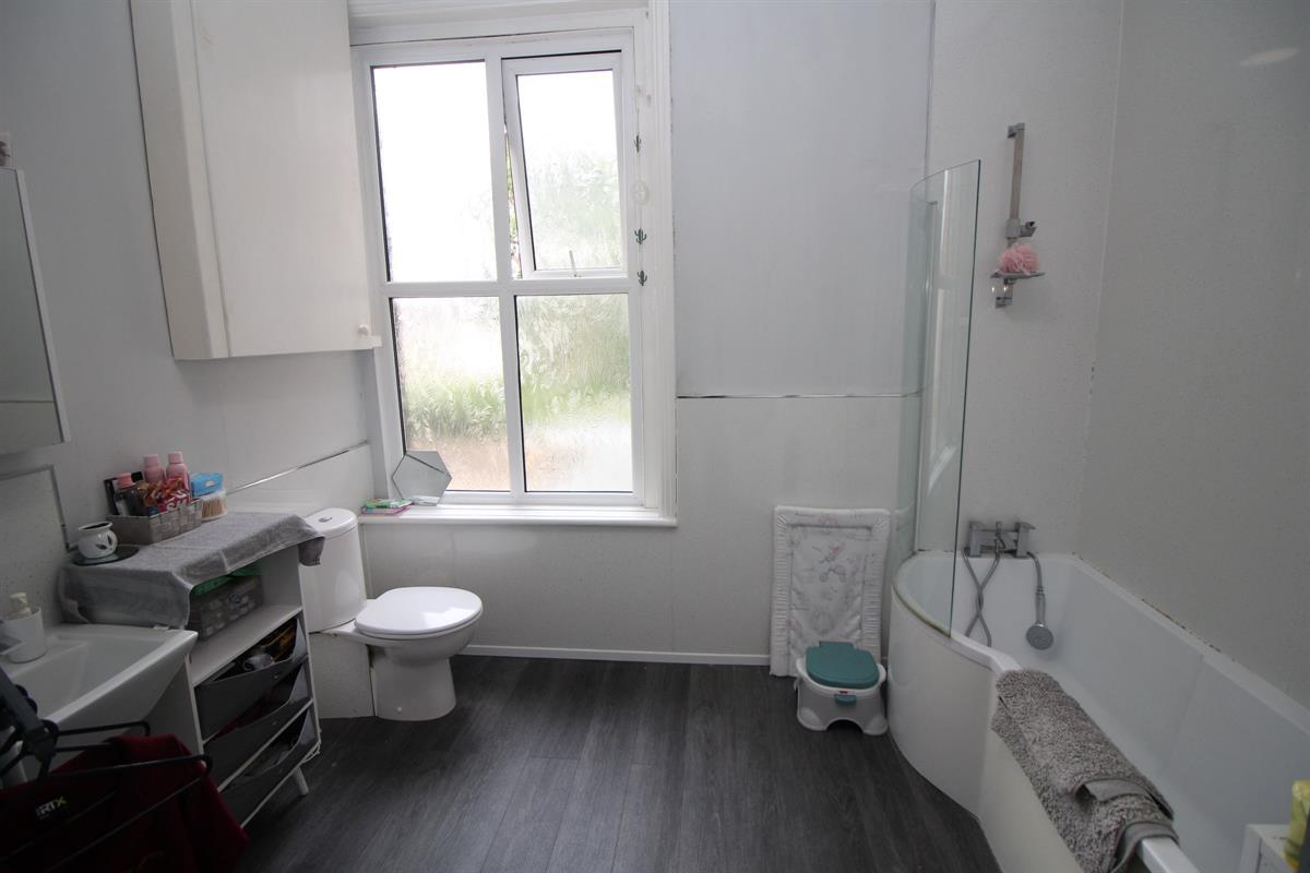 Fitted with a white suite comprising of panelled bath with mixer tap and shower attachment, pedestal wash hand basin, low level WC, radiator, storage cupboard, double glazed rear window.