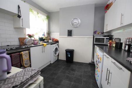 Double glazed window to rear. Single drainer sink unit set in roll edge work surfaces with cupboards under, further roll edge work surfaces with range of base and eye level units, tiled splash backs, space for washing machine.