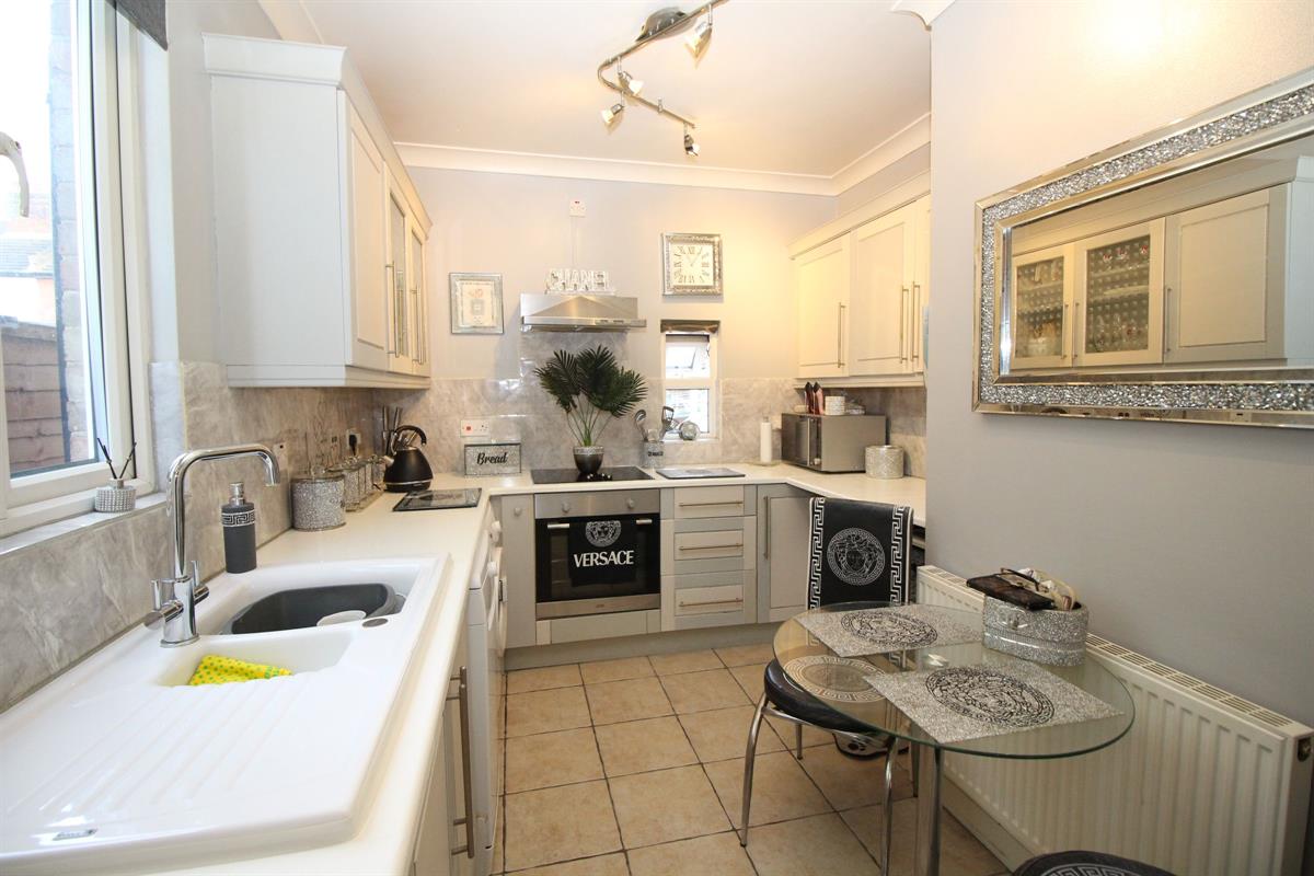 Fitted with a range of grey panelled fronted units comprising of laminated rolled edge work surfaces with cupboard, drawers and storage space below, inset white single drainer sink unit with mixer tap, matching eye level cupboards and display cabinet, fitted oven, hob and extractor hood, tiled floor, wall mounted gas fired boiler, double glazed side and rear window