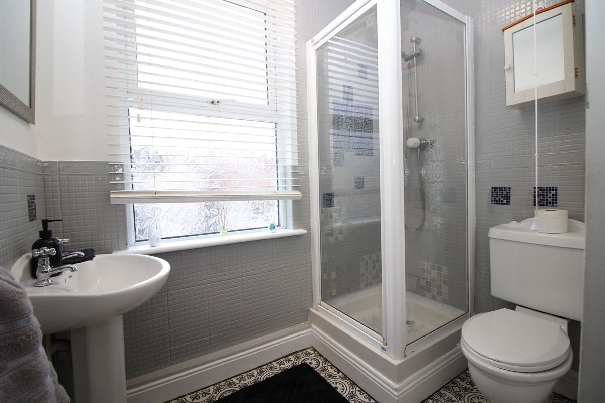 White suite with shower cubicle, pedestal wash basin, low level WC, radiator, extractor fan, double glazed front window
