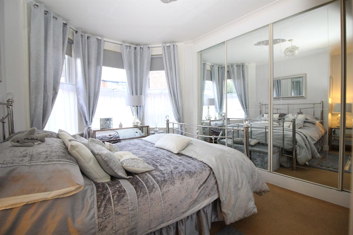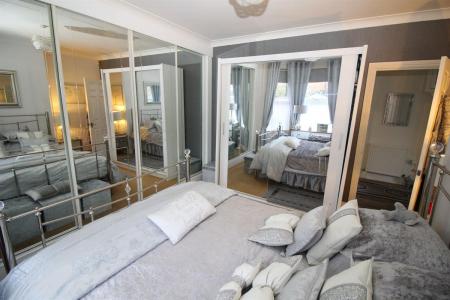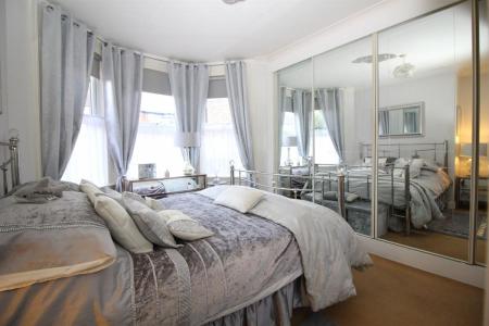 Fitted wall to wall wardrobes with mirrored sliding doors, radiator, double glazed bay window to rear