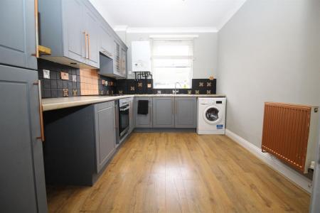 Fitted with a range of grey coloured fronted units comprising of laminated rolled edge work surfaces with cupboard, drawers and storage space below, inset single drainer sink unit with mixer tap, matching eye level cupboards, fitted hob, oven and extractor hood over, radiator, double glazed rear window
