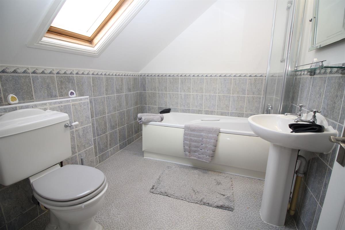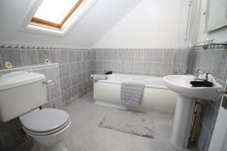 White suite comprising of panelled bath with mixer tap and shower attachment, pedestal wash basin, low level WC, part tiled walls, radiator, extractor fan, skylight front window