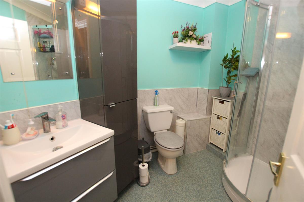 Comprising of corner shower cubicle, vanity wash hand basin with cupboards below and further cupboards beside, low level W.C, decorative panelling to walls, coved and skimmed ceiling, extractor fan, wall mounted heater.
