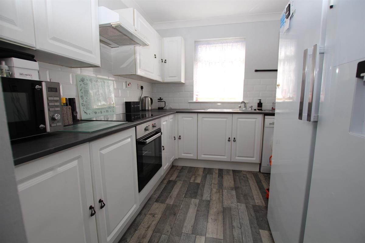 Modern fitted comprising of single drainer sink unit with mixer tap set in square edge work surfaces with cupboards under, further square edge work surfaces with range of matching base and eye level units, tiled splashbacks, space for washing machine, double glazed window to side.