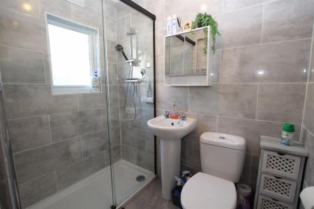 Modern fitted comprising of double shower cubicle, pedestal wash hand basin and low level W.C, tiling to walls, double glazed window to side.