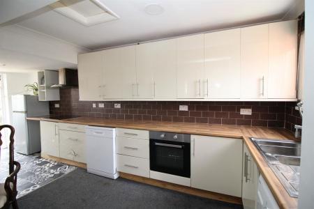 Fitted with a range of cream coloured laminated fronted units comprising wood block effect laminated rolled edge work surfaces with cupboard and drawers below, fitted oven plus fitted hob with extractor hood over, single drainer sink unit with mixer taps, matching eye level cupboards, tiled splash backs, radiator, double glazed window to front and rear and double glazed door to rear garden.