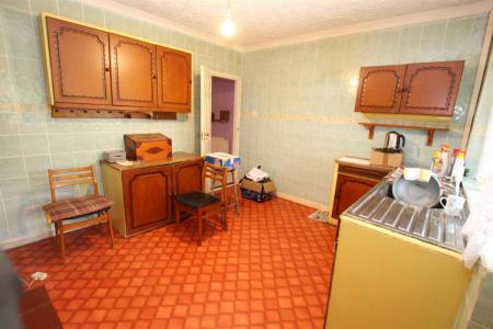 Single drainer sink unit with cupboard under, further range of fitted cupboards, one housing wall mounted gas boiler (not tested), window to rear, part glazed door through to