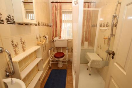 Double glazed window to side, double shower cubicle, low level W.C, wall mounted wash hand basin, tiling to walls, radiator.