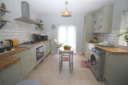 Fitted with a range of green coloured laminated fronted units with wood block work surfaces over, inset butler sink with mixer tap, eye level display cabinets, fitted oven, hob and extractor fan, tall cupboard housing wall mounted gas boiler, double glazed double doors to rear garden, open access to