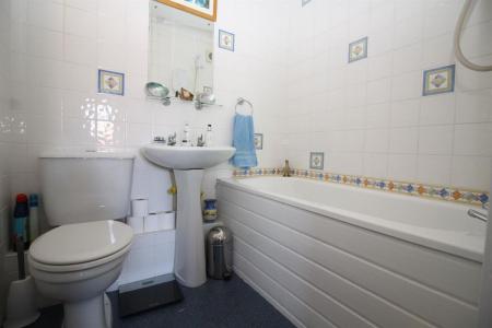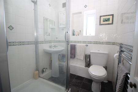 White suite comprising of shower cubicle, pedestal wash hand basin, low level WC, tiled walls, heated towel rail, double glazed rear window.