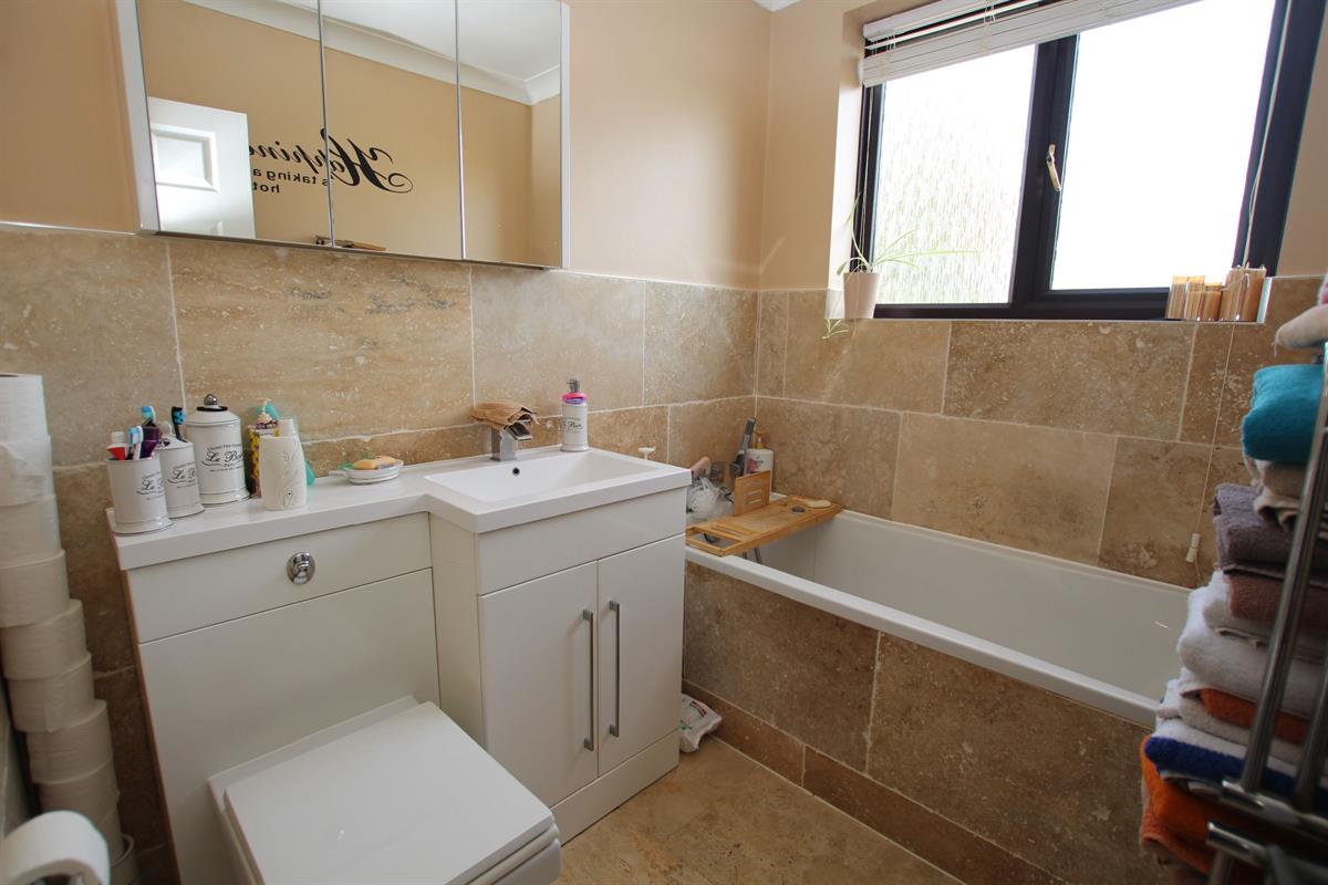 Three piece white bathroom suite comprising of tiled panel enclosed bath, low level W.C and vanity wash hand basin, tiled floors and half tiled walls, coved and skimmed ceiling, double glazed window to rear, heated towel rail.