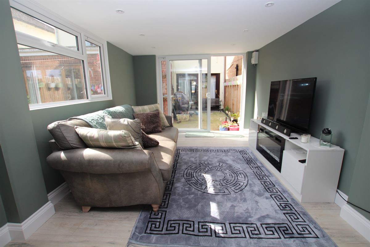 Double glazed French doors to front, three windows to side, two double radiators, double glazed sliding patio doors to rear garden, coved and skimmed ceiling with recessed spotlighting.