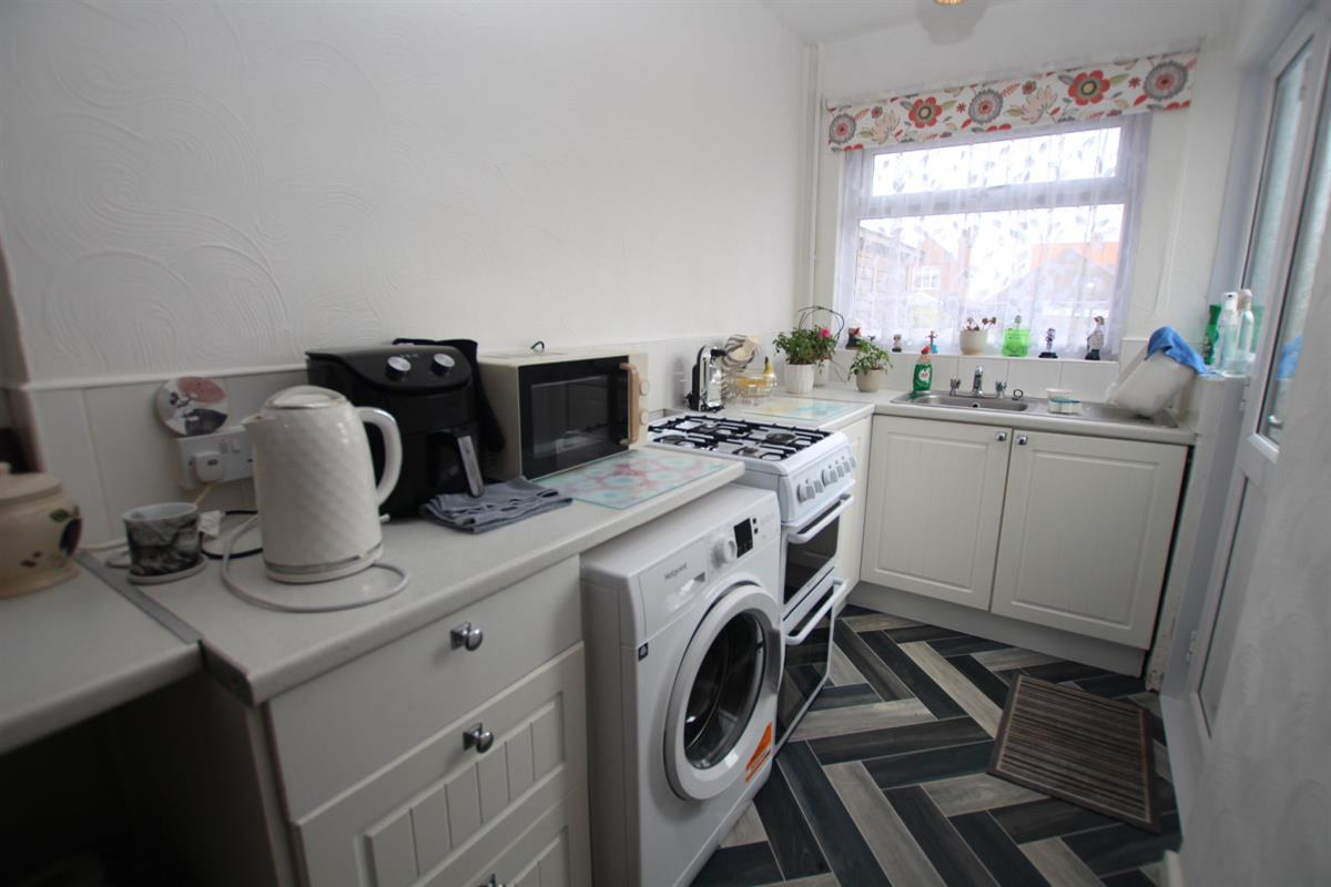 Comprising of single drainer sink unit with cupboard under, further roll edge work surfaces with matching base units, double glazed window to window, double glazed window to side and double glazed door to rear garden.
