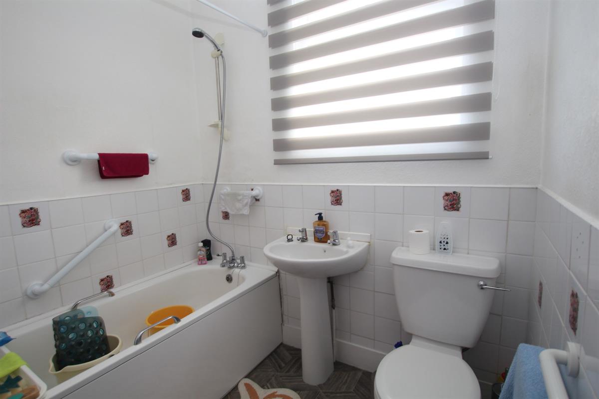 Modern white bathroom suite comprising of panel enclosed bath, pedestal wash hand basin and low level W.C, part tiling to walls, double glazed window to rear.