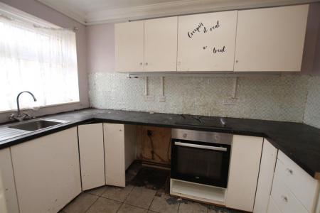 Double glazed window to front, single drainer sink unit set in roll edge work surfaces with cupboard under, further roll edge work surfaces and range of base and eye level units, wall mounted gas boiler for central heating and hot water.