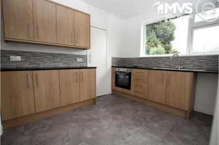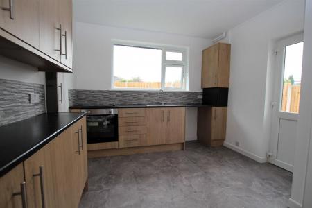 Newly fitted comprising of single drainer sink unit set in roll edge work surfaces with cupboard under, further roll edge work surfaces with range of matching base and eye level units incorporating built in oven with hob over, tiled splash backs, wall mounted boiler in matching cupboard, two fitted storage cupboards, double glazed window to rear, single radiator, double glazed door to rear garden.