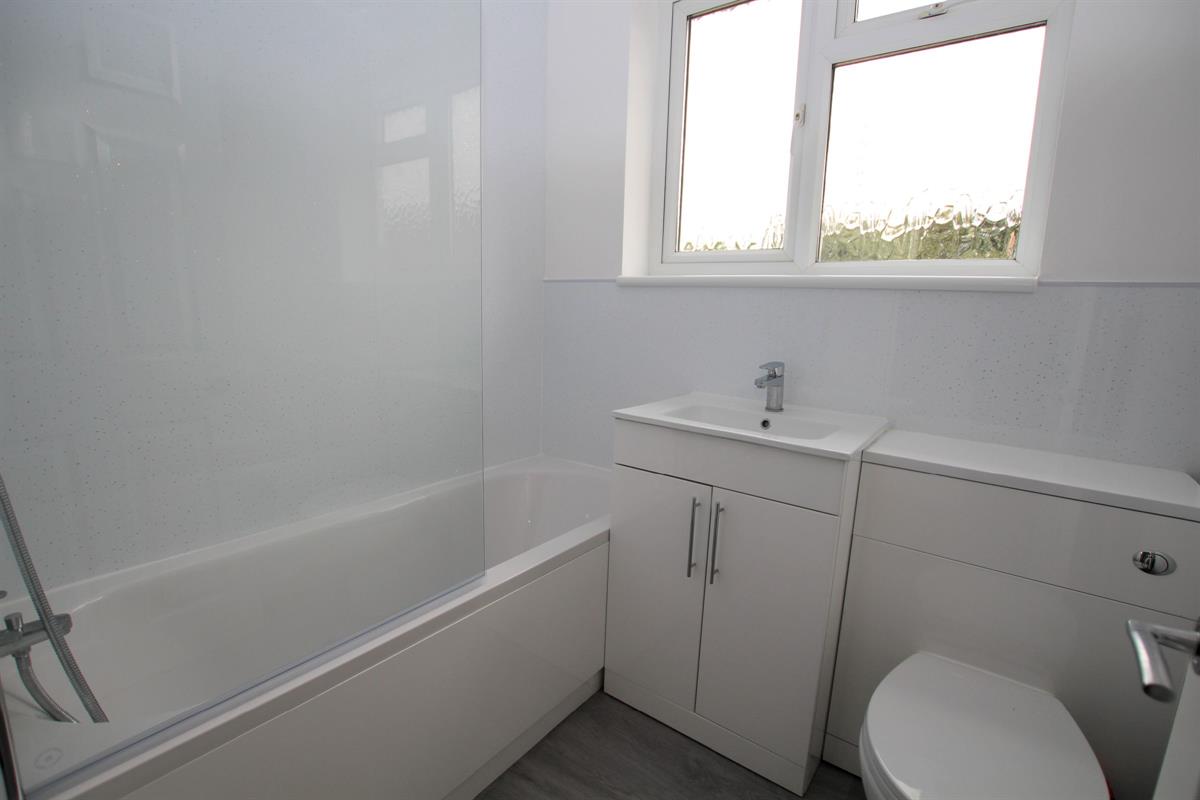 Brand new three piece white suite comprising of panel enclosed bath with mixer taps and shower attachment with fitted shower screen, decorative panel surround, vanity wash hand basin with cupboards below and close coupled W.C, double glazed window to side, chrome effect heated towel rail.