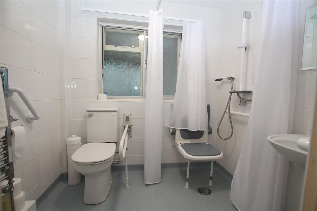 Wet room with low level W.C, wall mounted wash hand basin, fully tiled walls, chrome effect heated towel rail, secondary double glazed window to side.