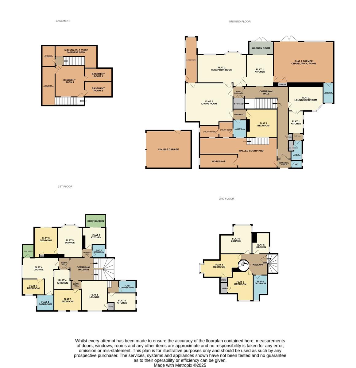 The property stands within a plot of approx third of an acre with a width to one side of approx. 37' which could potentially lend itself to a development plot, subject to planning. Formal gardens to the side and rear of the property are enjoyed by Flat 2, with ample parking facilities for the residents either side of the property. To the front the is a walled courtyard which has an external stair flight to the basement as well as a brick built, pitched roof workshop. There is also a detached double garage building although the roof is in a state of disrepair currently. We have been advised by the seller that within the grounds there is a tree that has a preservation order on it.