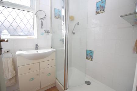 White suite comprising of shower cubicle with shower over and screen, vanity wash basin with storage below, low level WC, radiator, tiled walls, double glazed side window.