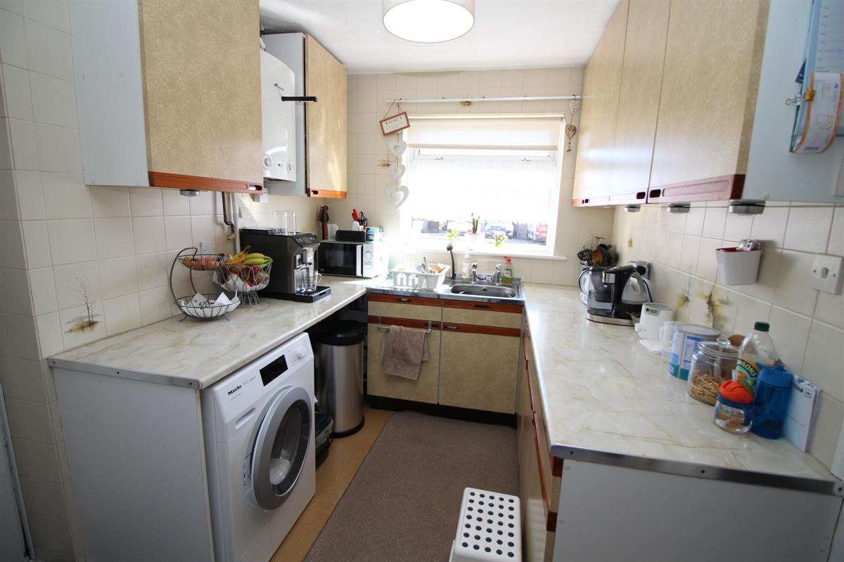 Fitted with a range of laminated fronted units comprising of laminated rolled edge work surfaces with cupboards and drawers below, matching eye level cupboards, larder cupboard, single drainer sink unit, tied walls, radiator, wall mounted gas boiler, double glazed front window and double glazed side door to passage.