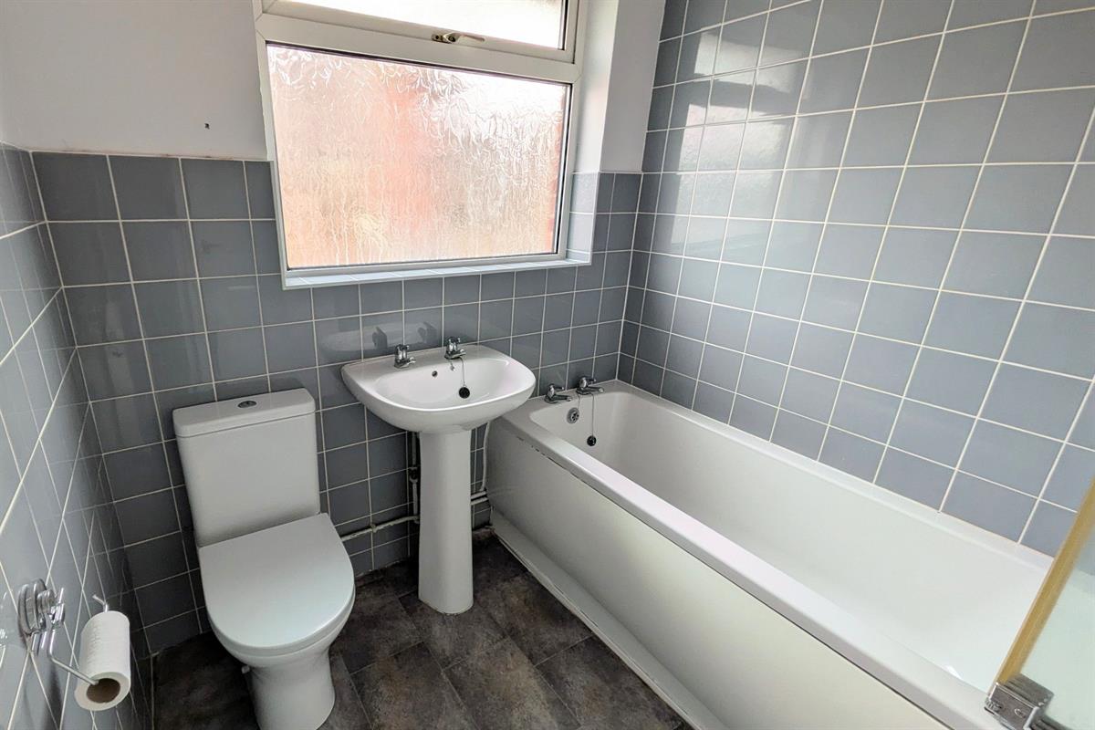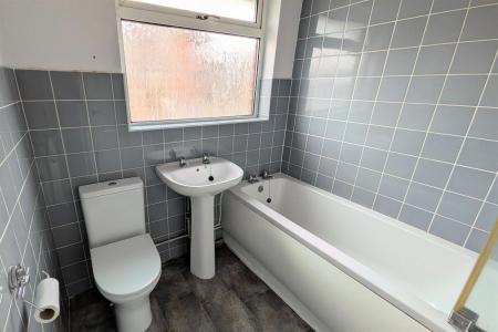 Double glazed obscure window to rear, white low level w.c, white pedestal wash hand basin with chrome hot and cold taps, white panel enclosed bath with chrome hot and cold taps, wall mounted electric shower, glass shower screen and wall mounted radiator