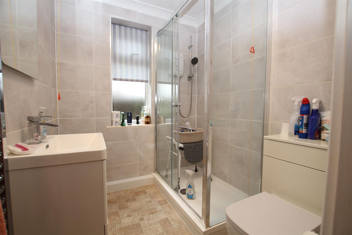 Comprising of double shower cubicle, low level W.C and pedestal wash hand basin, tiling to walls, heated towel rail, double glazed window to rear.