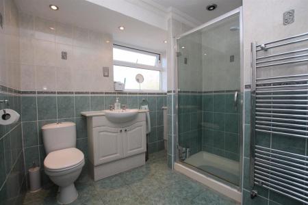 Double glazed window to side, vanity wash hand basin, low level w.c., tiled flor, fully tiled walls, heated towel rail, recessed spot lighting