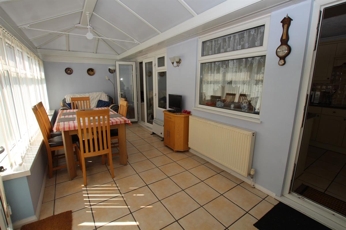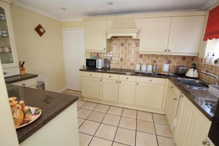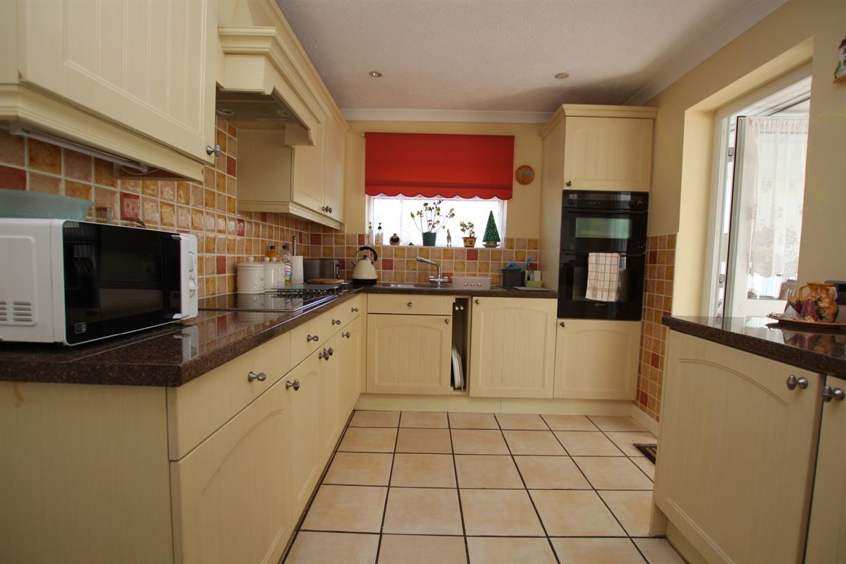 Double glazed windows to side and rear, modern fitted comprising of single drainer sink unit set in roll edge worksurfaces with range of matching base and eye level units, built in double eye level oven, integrated fridge and freezer, ceramic hob with integrated extractor hood over, tiled splashbacks, tiled floor, double radiator, double glazed door to conservatory