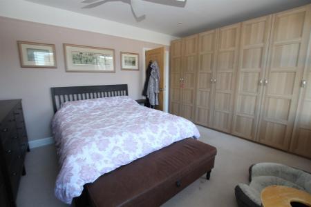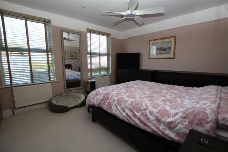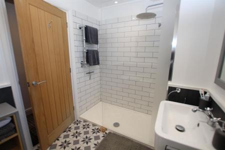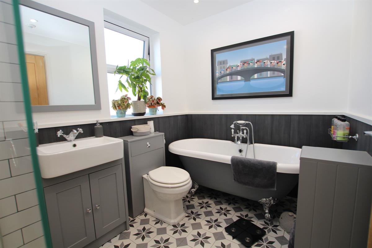 Luxury fitted four piece suite comprising of claw foot freestanding roll edge bath with centre mounted mixer taps, fully tiled double shower cubicle, low level W.C and vanity wash hand basin, decorative panelling to walls, heated towel rail, double glazed window to side, skimmed ceiling with sensor recessed spot lighting.