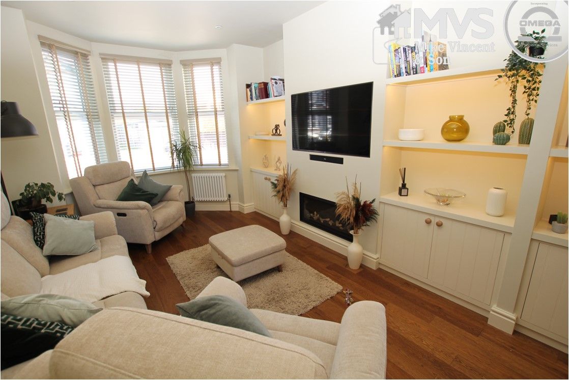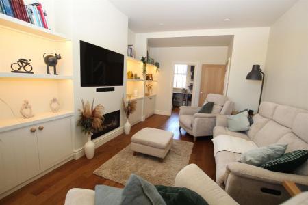 Double glazed bay window to front, two contemporary radiators, skimmed ceiling with recessed spot lighting, engineered Oak flooring, Inset TV and sound bar fitted flush within a feature wall with fitted cupboards and shelving either side featuring integrated lighting system, access to