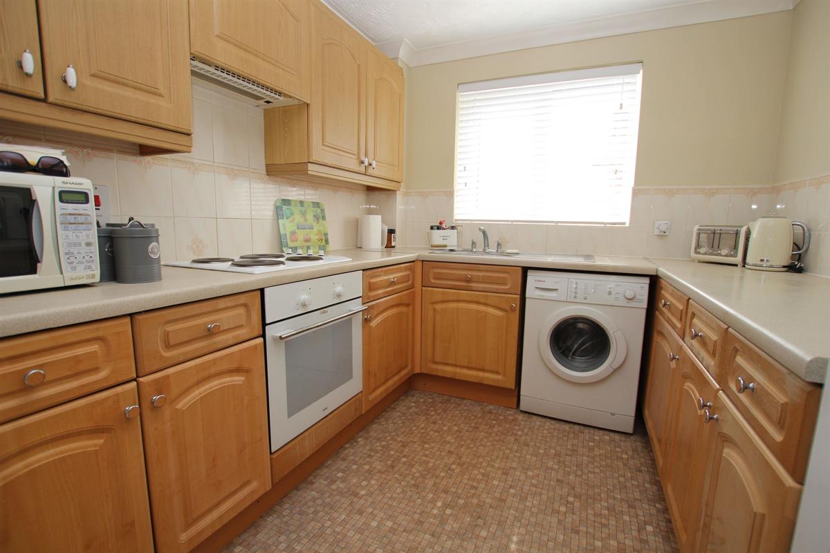 Double glazed window to side with sea views, fitted kitchen comprising of single drainer sink unit set in roll edge work surfaces with cupboards under, further roll edge work surfaces with range of matching base and eye level units, built in cooker and hob with integrated extractor hood over, space for washing machine and fridge freezer, tiled splashbacks.