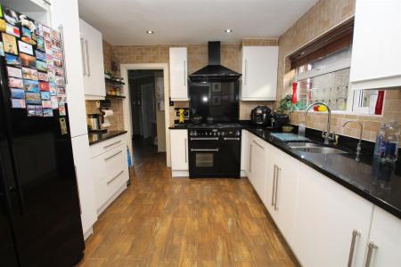 Double glazed window to side, modern fitted comprising of granite work surfaces with inset sink unit and cupboard under, further granite work surfaces with range of matching base and eye level units with integrated dishwasher, 3 drawer base unit, further cupboards with fitted racking, range cooker to remain, tiling to walls, extractor fan, under cupboard concealed lighting, skimmed ceiling with recessed spot lighting, open arch through to