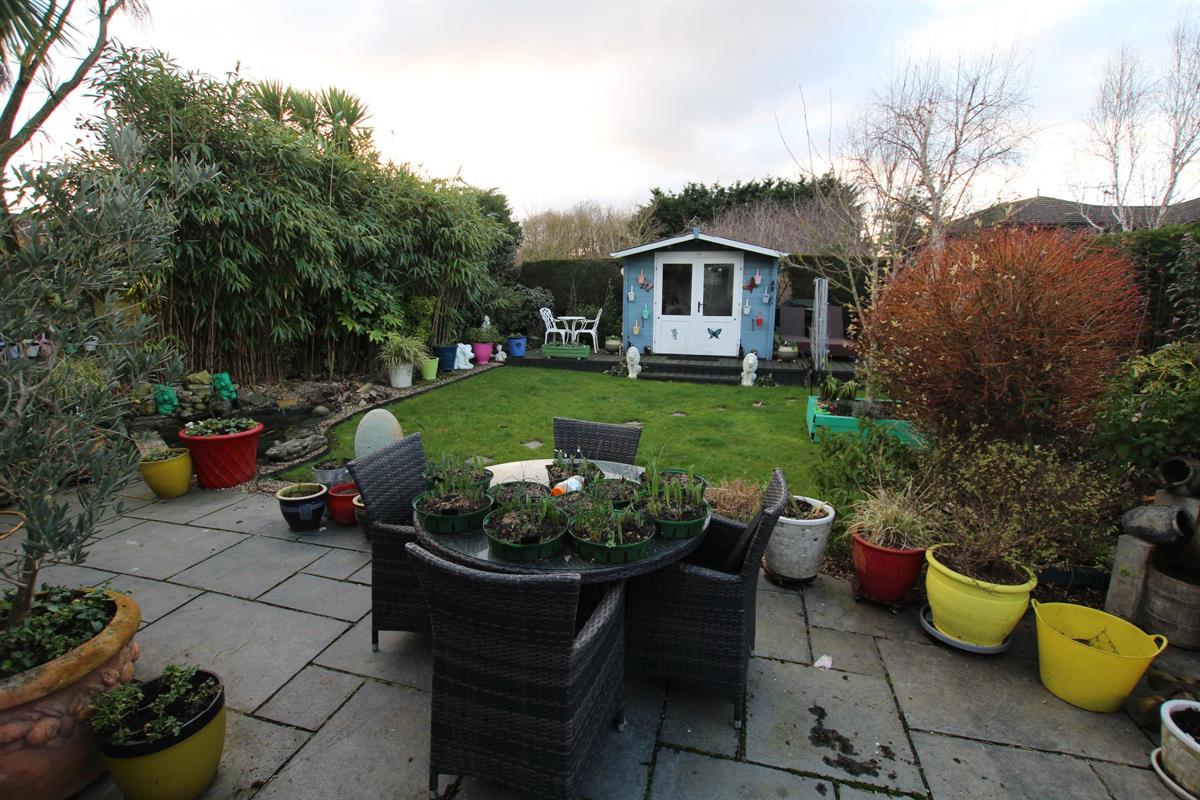 Mainly laid to lawn with paved patio area, lawn area, enclosed by mature shrubs, ornamental fish pond, decking area and summer house and greenhouse to remain.